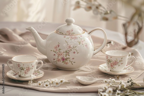 teapot, cup, elegant, classic, delicate, beverage, serving, kitchen utensile, home decor, table setting, tea-party, afternoon tea, upright, handle, lid, spout, saucer, hot beverage, ceramic, traditional, stylish, modern, tabletop, relaxing, refreshment, brew, afternoon tea, dainty, refined, decoration, china