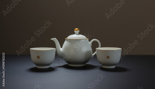 Elegant White Teapot with Cups on Wooden Table