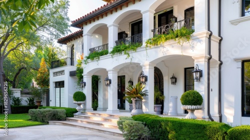 Elegant white villa with arched windows and lush greenery in a serene garden setting with bright afternoon sunlight