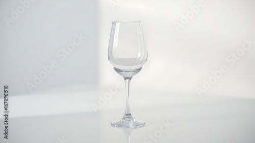Elegant white wine glass placed on a minimalist table with soft lighting reflections.