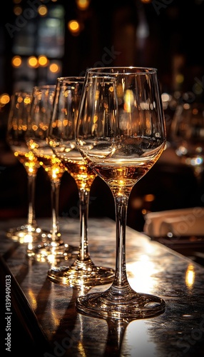 Elegant Wine Glasses Reflecting Warm Light in a Cozy Setting for Gourmet Dining or Wine Tasting Events