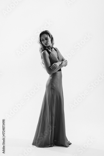 elegant, woman, gown, pose, confidence, background, graceful, fashion, coiffure, light, studio, beauty, modelling, portrait, dress, accessory, standing, expression, style, femininity, design, silhouette, serene, calm, aesthetic, sleek, luxurious, slender, classic, chic, contemporary, creativity, model, showcase, attire, body, language, shoot, visual, art, clothing, figure, minimalism, modern