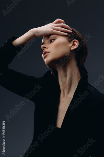 woman, black, elegant, outfit, pose, beauty, style, fashion, portrait, female, model, graceful, sophisticated, hand, raised, dark, background, expression, young, attractive, person, posture, clothing, stylish, confident, hair, skin, profile, high, minimal, classic, trend, modern, face, gesture, smooth, soft, light, authentic