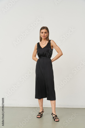 apparel, attracted, art, attractive, beautiful, beauty, black, casual attire, caucasian, clothes, clothing, confidence, confident, creative, design, dress, elegant, fashion, fashionable, female, femininity, girl, indoor, leg, lifestyle, light, look, minimalist, model, modern, natural, outfit, portrait, pose, posing, sandal, showcase, simplicity, sleek, stance, standing, studio, style, stylish, trend, visual, woman, youth