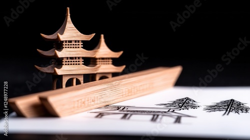 Elegant wooden chopsticks and a traditional pagoda model, symbolizing Asian culture and dining traditions.