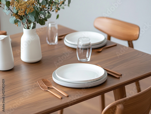 dining table, wooden table, table setting, plate, goggles, cutlery, vase, greenery, decor, arrangement, home, interior, wood, elegant, flower, dinner, gathering, hospitality, utensil, simplicity, design, tableware, modern, inviting, atmosphere, mealtime, aesthetic, dinnerware, kitchen, cosy, fresh, natural, entertaining, food, family, friends, warmth, style, relax