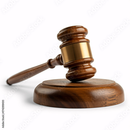 Elegant wooden gavel poised above sound block, symbolizing justice, law, and decision-making with professional authority.