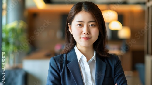 Elegant young Asian businesswoman in a formal blazer, confidently posing in an upscale office, warm and inviting background
