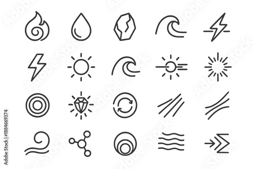 elemental, energy, icon, line, style, fire, swirl, water, dripped, rock, shard, wind, lightning, spark, glowing, core, wave, motion, beam, ring, pulse, radiating, stone, circle, burst, flow, curve