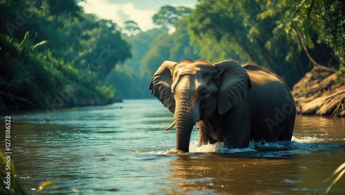 elephant, river, wading, calm, greenery, tropical, forest, nature, wildlife, animal, habitat, ecosystem, water, landscape, tranquil, peaceful, jungle, environment, flora, fauna, safari, adventure, serene, daytime, sunlight, scenic, biodiversity, natural, mammal, large, body, flow, forested, colourful, vibrant, majestic, beast, many, isolated, vegetation, shore, terrain, travel