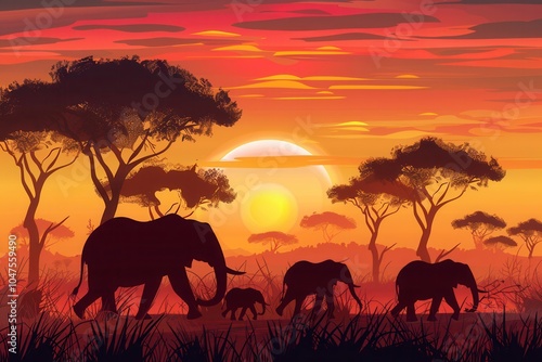 elephant, family, savanna, sunset, africa, nature, wildlife, silhouette, walking, landscape, orange, sky, tree, natural, habitat, herd, journey, colours, peaceful, safari, environment, maternal, bond, evening, light, vegetation, adventure, animal, behaviour, mammal, shadow, scenic, tranquil, wilderness, protected, area, biodiversity, beauty, grass-land, migration, iconic, generative, ai