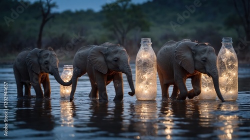 elephant, water, bottle, light, nature, wildlife, dusk, calmness, environment, beauty, habitat, animal, illumination, serenity, landscape, adventure, exploration, group, mammal, young, playful, scenery, peaceful, evening, charme, flora, fauna, journey, connection, ecosystem, conservation, wonder, magic, river, atmosphere, glow, silhouette, elegance, harmony, natural, scene, nocturnal, enchanting, twilight