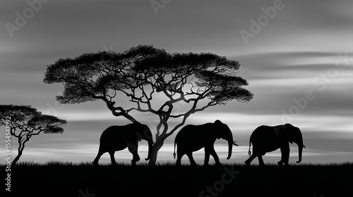 elephant, walking, tree, standing, silhouette, greyscale, sky, cloud, landscape, grass, field, animal, mammal, wildlife, nature, africa, african, savanna, plain, horizon, scene, illustration, artistic, peaceful, wild, background, travel, safari, adventure, exploration, mammalian, trunk, large, plant, flora, foliage, countryside, environment, ecological, conservation, wild animal, natural world, grey, monochrome