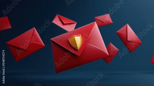 Email security, spam call. Colorful red envelopes with a shield, symbolizing secure communication and protection.