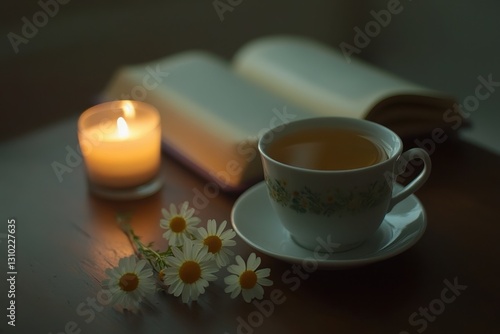 calming, cosy, candlelight, book, relaxation, calmness, peaceful, evening, warm, beverage, daisy, comfort, home, leisure, stillness, reading, ambience, soothing, nature, aromatic, cup, mindfulness, enjoyment, herbal, delicate, retreat, wellness, moment, serenity, light, quiet, glasses, porcelain, still life, table setting, home decor, floral, refreshment, avocation, generative