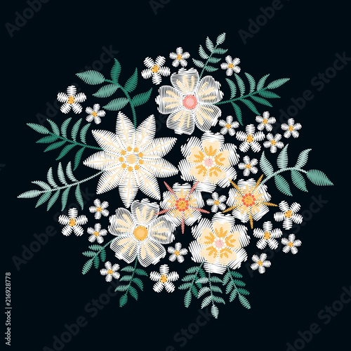 Embroidery. Bouquet with beautiful white flowers and green leaves. Elegant floral composition on black background.