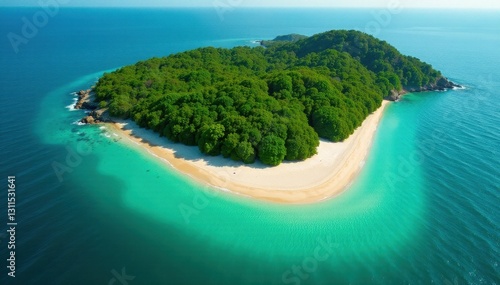 Emerald isle, vibrant foliage contrasts with bright sand, aerial perspective , remote, coast, breathtaking