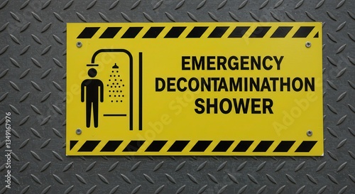 Emergency Decontamination Shower Sign on Textured Gray Metal Wall Background