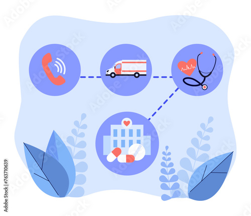Emergency service network concept. Vector illustration. Emergency call, ambulance car, stethoscope, hospital and medicine