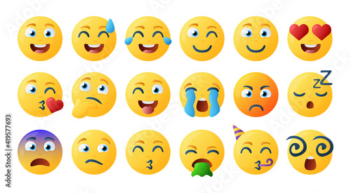 Emoji set pack icons for apps. Bundle of bright emoji with simple gradient.