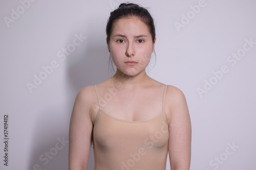 emotional portrait of attractive brunette, actress in a beige undershirt - bodysuit on white background. space for text. High quality photo
