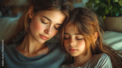 emotional scene of a worried mother comforting her depressed teen daughter, emphasizing the importance of support and love during challenging times, set in a cozy home environment