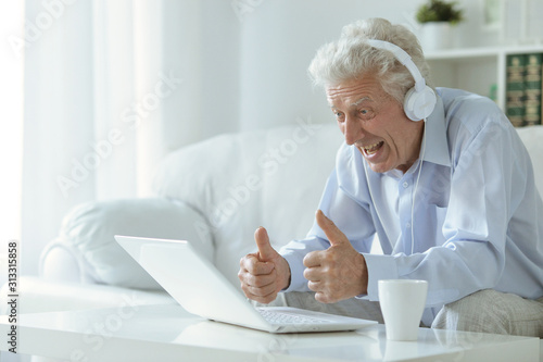 Emotional senior man using laptop at home