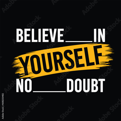 Empower your space with this bold and motivational typography design featuring the phrase "Believe in Yourself, No Doubt". The design creatively emphasizes the word YOURSELF with a vibrant yellow pain