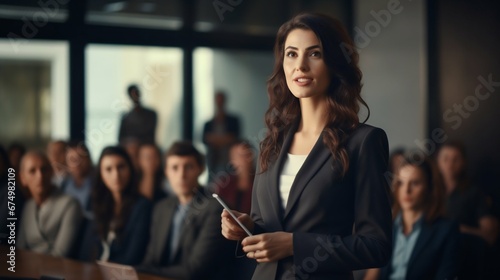 Empowering Leadership: Female Business Executive Inspires at Conference Presentation. Generative ai