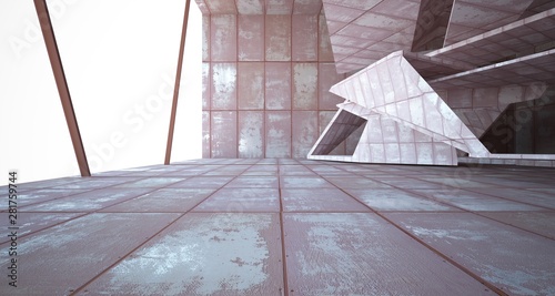 Empty abstract room interior of sheets rusted metal. Architectural background. 3D illustration and rendering