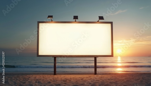 Empty ad hoarding stands on beach at sunset. A billboard with blank space for advertising on sea coast sand during evening twilight. Natural beauty meets promotion, vacation destination.