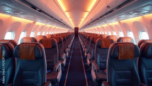 Empty Airplane Cabin Interior Rows of Comfortable Seats with Warm Lighting and Carpeting
