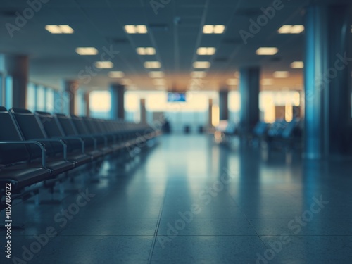 Empty airport departure lounge interior with rows of seats and a glossy, reflective floor. Blurred modern background lighting provides a sense of travel and anticipation.