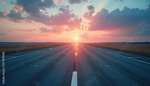 Empty airport runway at sunset with colored sky and clouds. View evokes calmness and solitude, creating serene atmosphere. Road markings on tarmac. Open space for landing. Aviation and travel concept.