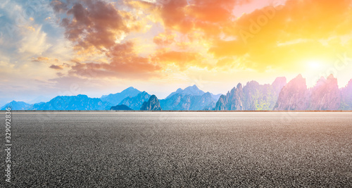 Empty asphalt road and green mountain with colorful clouds at sunrise,panoramic view.