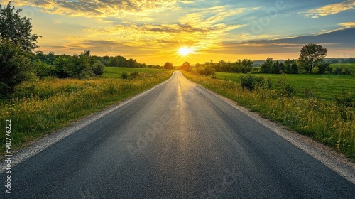 Empty asphalt road in a rural setting with a beautiful sunset on the horizon