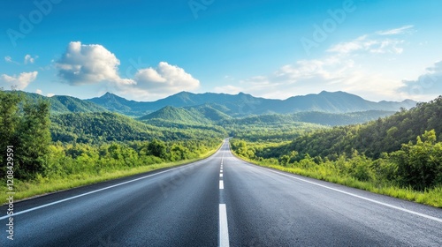 road, asphalt, empty, green, mountain, sky, blue, cloud, white, line, horizon, landscape, travel, journey, destination, freedom, nature, scenic, beautiful, serene, peaceful, open, perspective, drive, adventure, summer, day, sunlight, forest, tree, grass, vegetation, hill, peak, vale, distance, long, straight, winding, curve, lane, marking, paved, surface