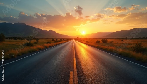 Empty asphalt road stretches toward horizon at sunset with mountains. Golden sun rays pierce clouds over green fields and distant hills. Wide open sky.