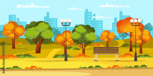 autumn, beautiful, building, city, city landscape, cloud, empty, environment, foliage, garden, green, lamp, landscape, nature, october, orange, outside, post, public, scenery, sky, street, town, tree, urban, view, yellow, no people, nobody, panorama, bench, fall, park, recreation, rest, season, wood, artwork, background, cartoon, colours, composition, drawing, flat, graphic, hand-drawn, horizontal, illustration, vector