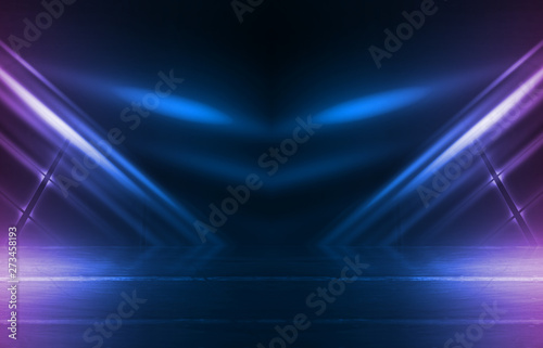 Empty background scene. Dark street reflection on wet asphalt. Rays of neon light in the dark, neon figures, smoke. Background of empty stage show. Abstract dark background.