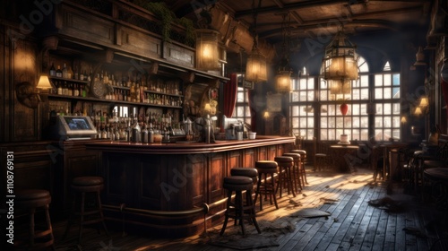 bar, interior, pub, counter, stool, wood, empty, dark, light, window, table, chair, lamp, bottle, goggles, shelf, vintage, retro, rustic, brown, gold, shadow, floor, day, evening, room, corner, design, classic, old, wooden, warm, comfortable, cosy, darkroom