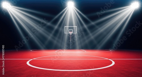 Empty basketball court illuminated by bright spotlights, ready for a game