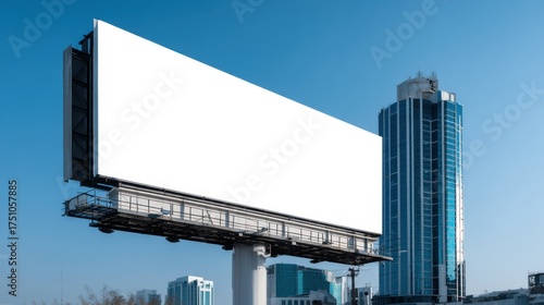 Empty Billboard Against Urban Skyline with Clear Blue Sky and Modern High-Rise Building, Perfect for Advertising Concepts and Marketing Campaigns