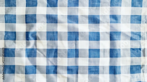 Empty blue and white checkered kitchen cloth top view for food and product display.