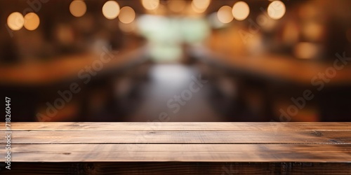 Empty brown wooden table with blurred coffee shop background, perfect for photomontage or product display.