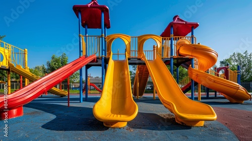 Empty children's playground with bright yellow slides, vibrant and inviting, clean and well-maintained, captured under a clear blue sky