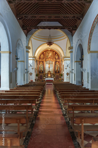 Empty Church Nave with Symmetrical Aisle, Wooden Ceiling and Gilded Altar