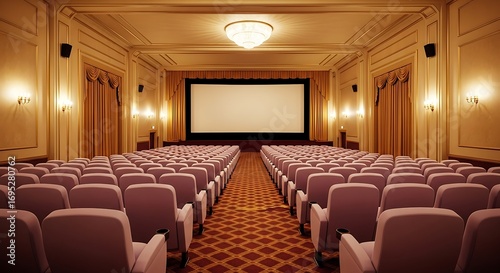 cinema, theatre, motion picture, screen, audience, seat, auditorium, empty, interior, room, hall, entertainment, viewing, projector, film, show, performance, decorated, luxurious, plush, classic, vintage, ornate, lighting, row, back, perspective, place, culture, leisure