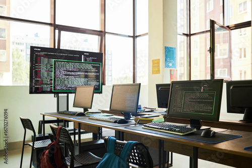 Empty classroom with multiple computer workstations displaying programming code on monitors, modern educational setting with large windows and backpacks on chairs