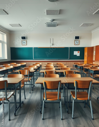 Empty classroom with vintage wooden lecture desks and chairs, back to school concept in high school, secondary education studying, sticker style, with white tones